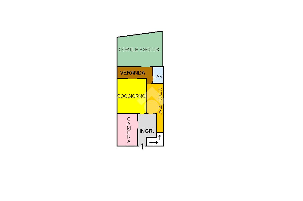 Accediamo dall'ingresso al piano terra, composto da: un luminoso soggiorno di 18 mq collegato ad una veranda di 6 mq con uscita sul cortile esclusivo di 28 mq, una cucina separata ed abitabile di circa 10 mq che garantisce privacy agli ambienti, una camera singola di circa 11 mq ideale come studio o stanza per gli ospiti ed infine una piccola lavanderia.